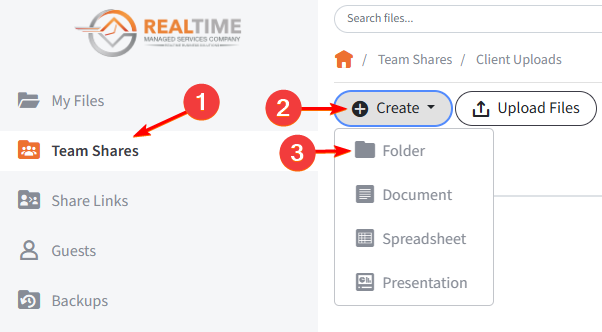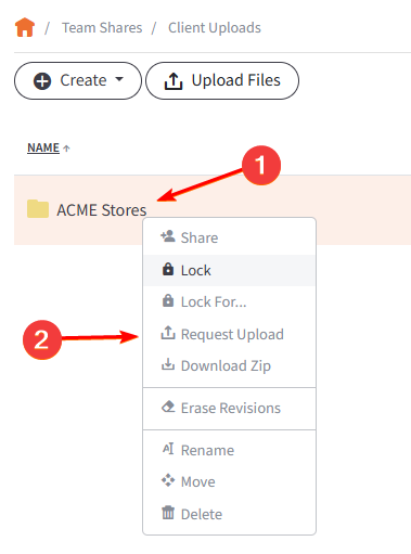In this example we will create an Upload Request Folder for a client named ACME Stores inside Team Shares.