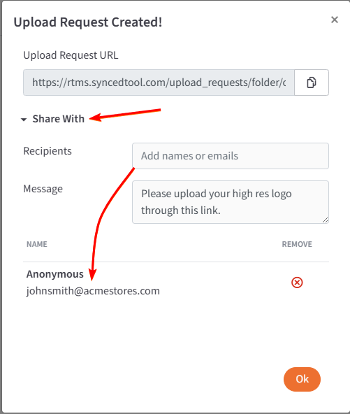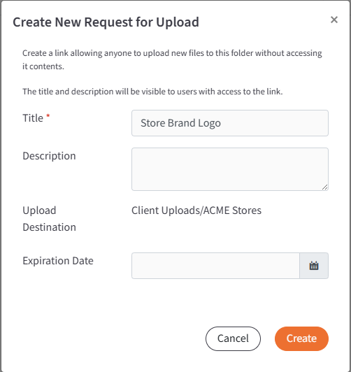 With upload requests, you can generate a link allowing anyone to upload files to any Upload Folder you create.